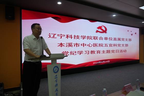为深入开展党纪学习教育,进一步提高党员的纪律意识,加强党性修养,日前,华体买球联合单位直属党支部与本溪市中心医院五官科党支部在我校共同举办了党纪学习教育主题党日活动。我校纪委书记闫海军、党委宣传部部长于泳、联合单位党支部书记李昱献,市中心医院五官科支部书记祁辉,两个支部的全体党员参加此次党日活动。活动由李昱献主持。