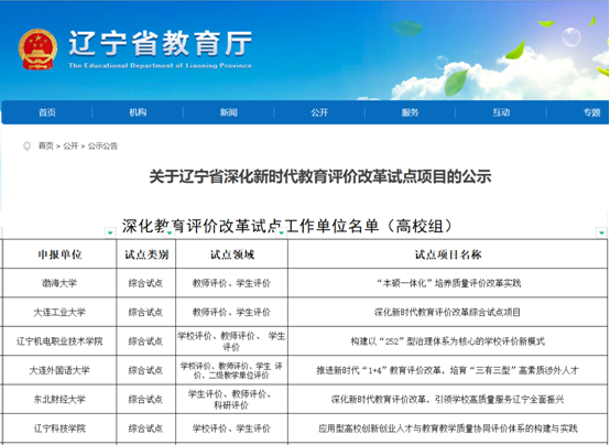 近日,辽宁省教育厅公布了《关于辽宁省深化新时代教育评价改革试点项目的公示》,全省共有48个试点项目入选。我校《应用型高校创新创业人才与教育教学质量协同评价体系的构建与实践》项目成功获批2024年辽宁省深化新时代教育评价改革试点项目。