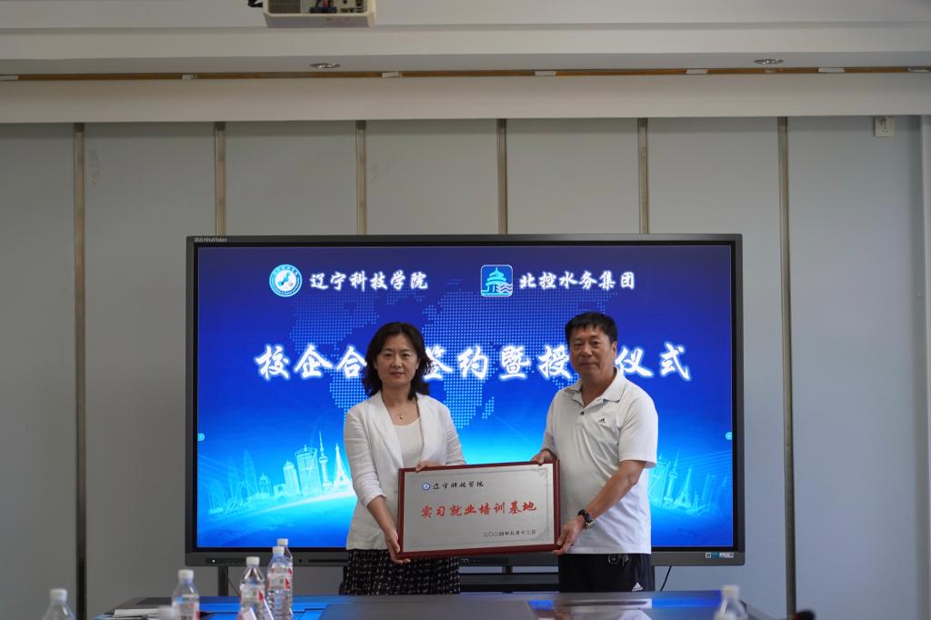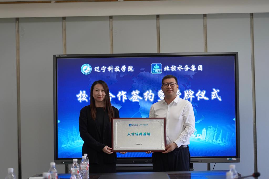 北控水务集团北水教育总经理冀广鹏和教务处长韩娇为“人才培养基地”揭牌。