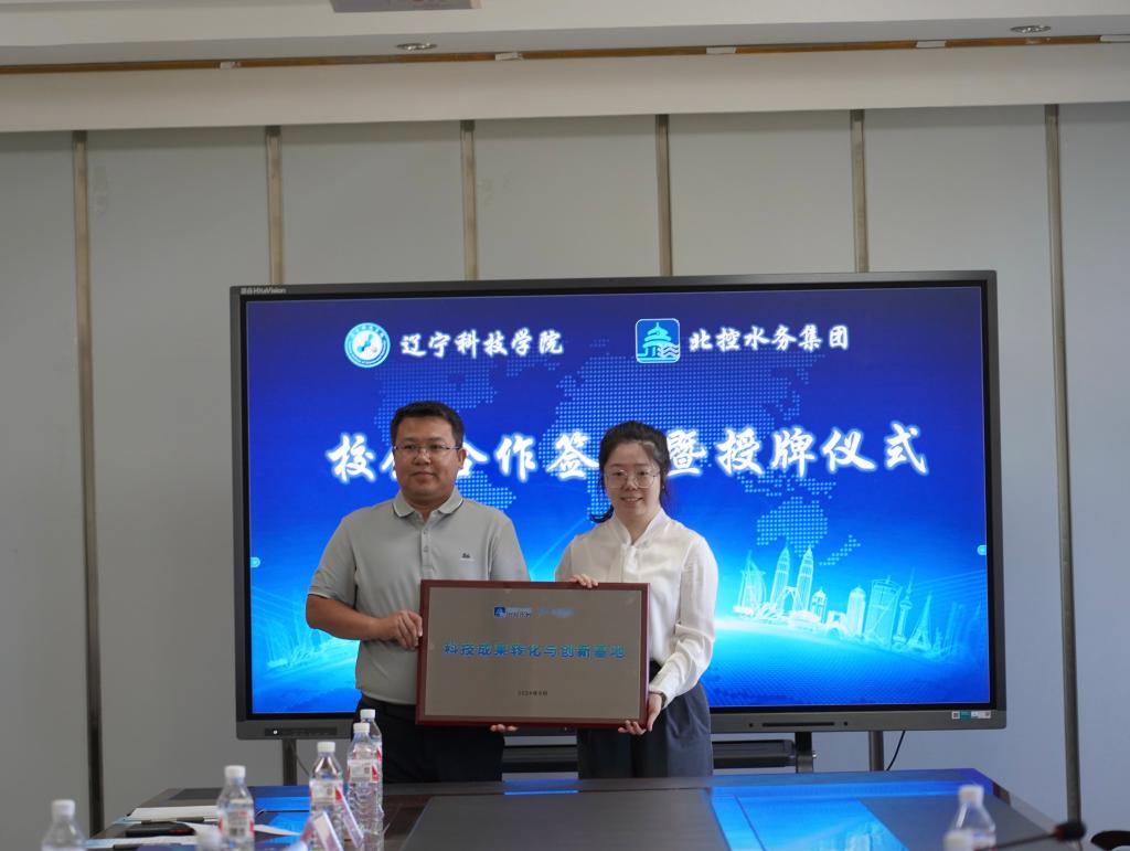 生物医药与化学工学院党总支书记纪丽岩为北部大区东北业务区本溪小市污水处理厂项目公司颁发“实习就业培训基地”牌匾。