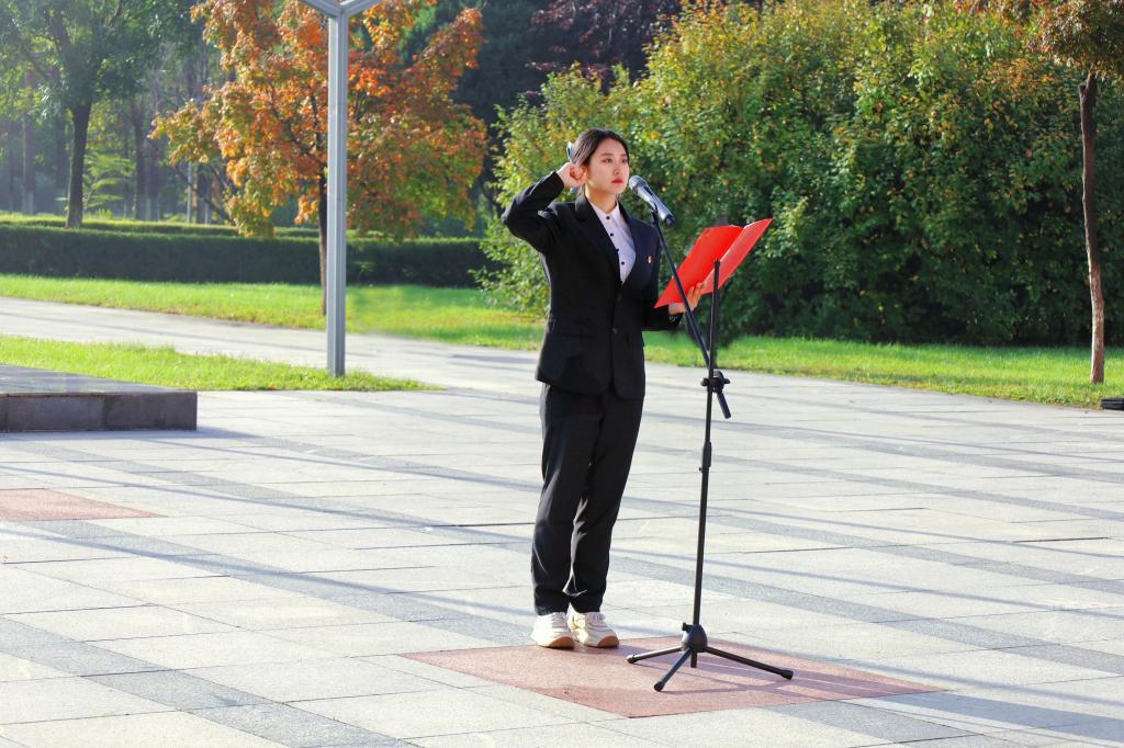 学生代表张雅蓉带领全体学生在国旗下庄严宣誓“激情飞扬,梦想启航!勤勉为学,忠勇报国!胸怀大志,脚踏征程!青春璀璨,国梦飞扬!风华正茂,挥斥方遒!昂扬斗志,绽放光芒!”誓言铮铮、响彻云霄,每一个字都饱含着师生们对祖国的深情和为祖国奋斗的决心。宣誓者将铭记先辈夙愿,肩挑民族复兴重担,以青春之名,铸就辽科之辉煌,共筑中华之强盛。