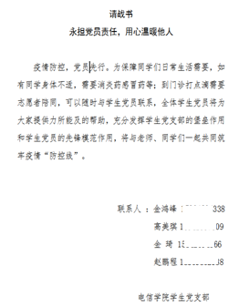 责任如山,以党支部临时党小组为核心,学生干部、志愿者迅速汇聚到一起,他们承担的工作量是巨大的,从负责人到志愿者,每一位同学都很辛苦。有的同学连续几个小时搬运物资累得手都抬不起来,有的同学在寒风中发放物资饭也顾不上吃。为了保护“我们的家园”,大家一起早起、熬夜、吹风。疫情不会太久,春天定会到来!全体电信人将勠力同心、共度时艰,坚守付出、拼搏奉献,共同期待冰雪消融、春暖花开。